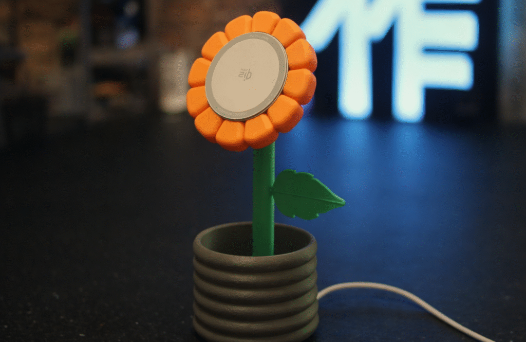 All visible parts (flower petals, stem, leaf, and pot) are 3D-printed components included in this file set. The wireless charger itself is not included and must be purchased separately.
